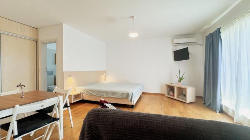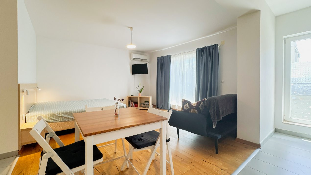 Garsoniera dispune de un balcon de 4.38 mp, cu acces direct și din bucătărie, ceea ce adaugă un plus de funcționalitate în viața de zi cu zi. Locul de parcare este situat în imediata vecinătate a balconului, un detaliu practic care permite accesul rapid în imobil. Prețul locului de parcare este de 5000 Euro și nu este inclus în prețul de listing.