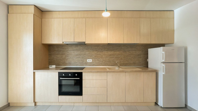 Zona de zi este luminoasă, cu ferestre mari și finisaje moderne în tonuri calde. Bucătăria open-space este complet utilată cu cuptor, hotă și frigider, având mobilier proiectat pentru eficiență și utilizare ușoară.
