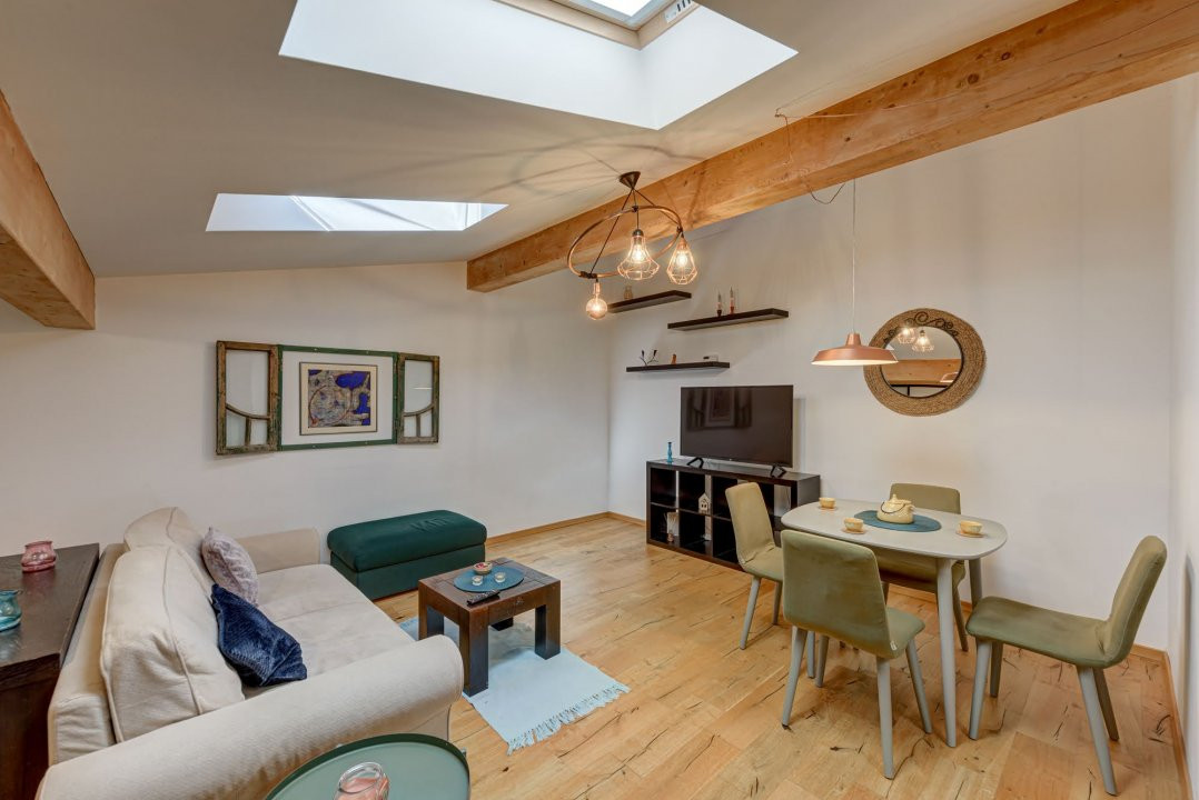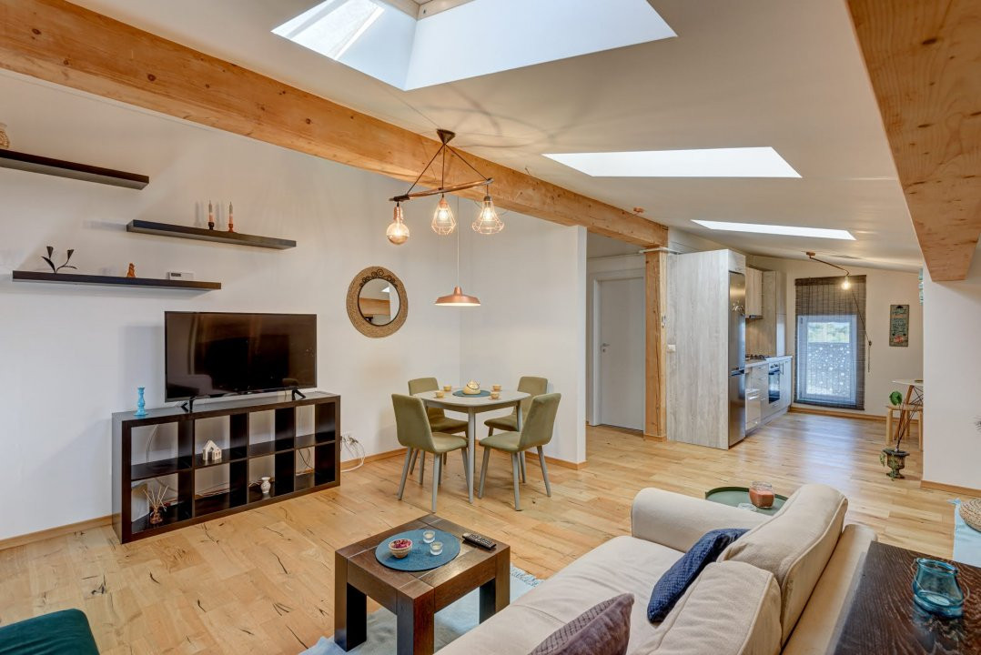 Apartamentul este situat in ansamblul LaRa Condominium – Otopeni, intr-un imobil P+2E+M, la mansarda. Si ca orice spatiu de mansarda are acel aer boem, iar grinzile lasate la vedere, in culoarea naturala a lemnului, parchetul stratificat in culoarea lemnului nobil si obiectele decorative hand made completeza atmosfera boema.