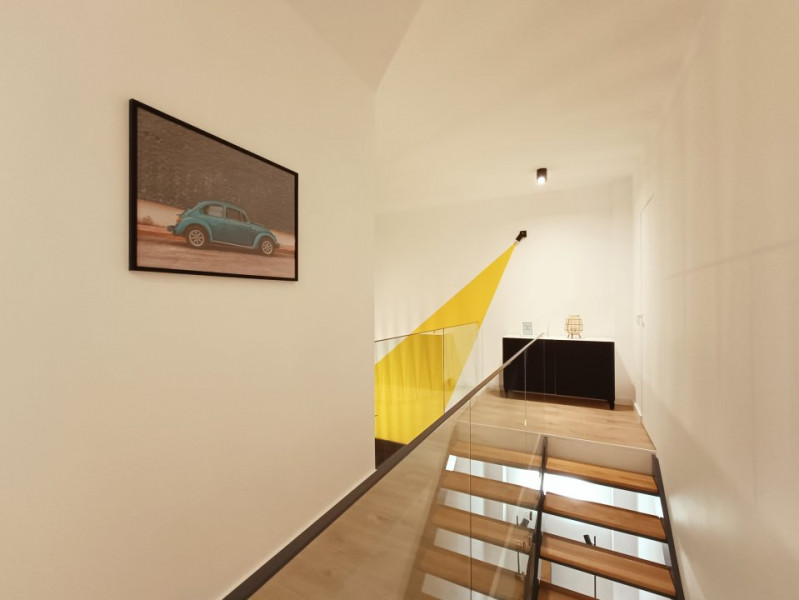 Legatura dintre cele doua etaje se face printr-o scara moderna din sticla securizata si trepte de stejar masiv. Si pentru un maxim de aspect modern s-au folosit usile de interior Filomuro cu toc ascuns.