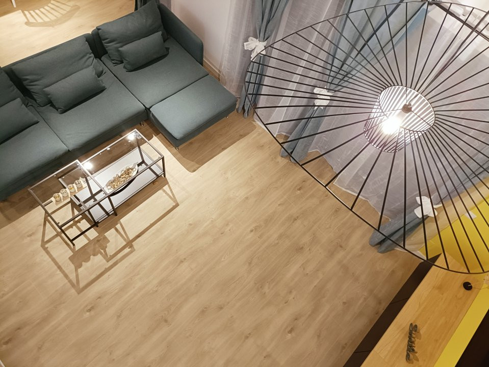Piesa de rezistenta a acestui duplex este livingul pe doua etaje ceea ce amplifica senzatia de spatiu si lumina, iar vedeta amenajarii este lampa-palarie care leviteaza si creeaza un joc de umbre si lumini. Un adevarat spectacol de lumini si umbre direct de la tine din canapea! Pam-Pam!