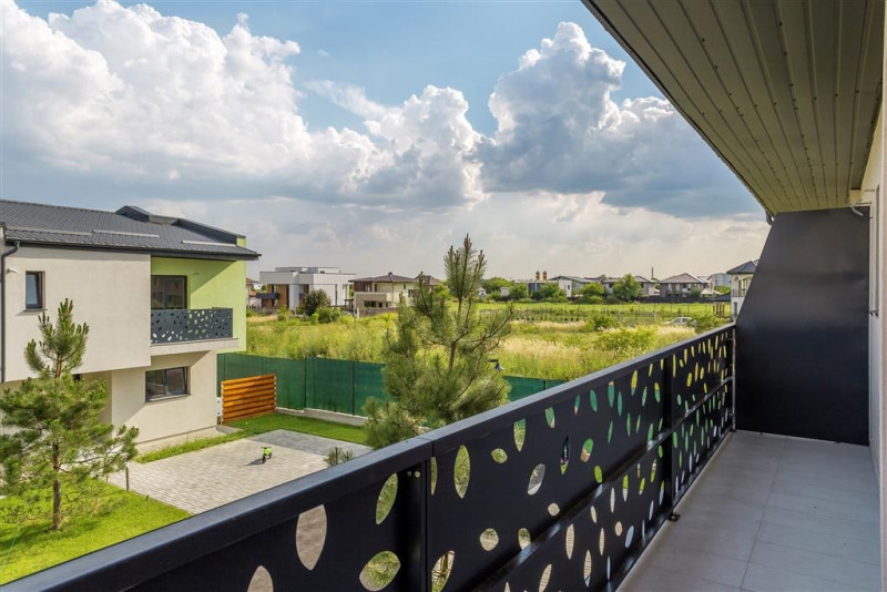 Cand urci catre etaj, pe scara din stejar natur, pe hol privirea iti fuge catre un fain dressing, destinat celor doua dormitoare, ce beneficiaza de o baie, cu acces din acelasi hol. Aceleasi dormitoare au acces catre un balcon comun, ca sa nu fie suparare. Nu pot trece mai departe fara sa mentionez ca dormitorul cel mai mare are o suprafata de 26,92 mp, suficient pentru dormitor cat si pentru un spatiu de lucru, asta daca nu cumva doresti sa-l transformi  in doua camere. Inainte de a cobori la parter ochiul aluneca alene sus, catre zona de pod, acolo unde poti sa urci utilizand scara pliabila de acces la pod, raiul spatiilor de depozitare.