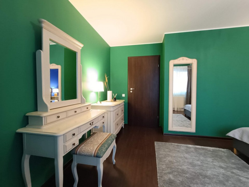 Dormitorul matrimonial este elegant, cu un aer parizian, are o suprafata considerabila si dispune de un dressing ascuns privirii, perfect pentru outfit-urile sotiei. :)