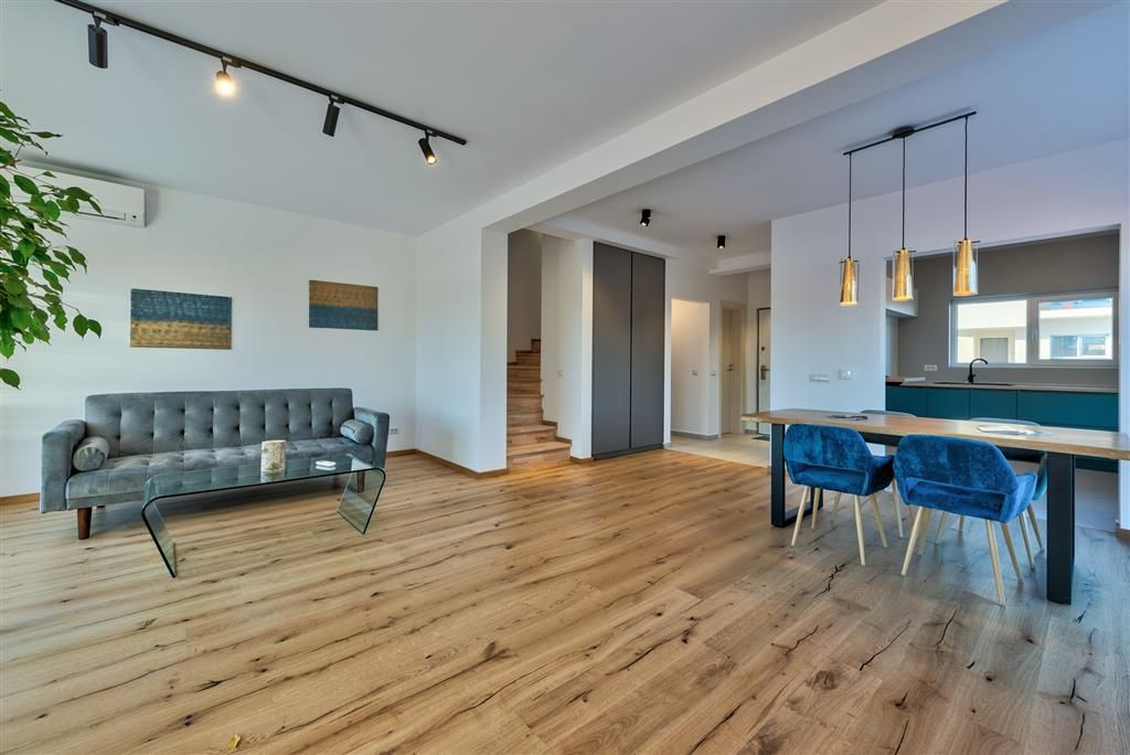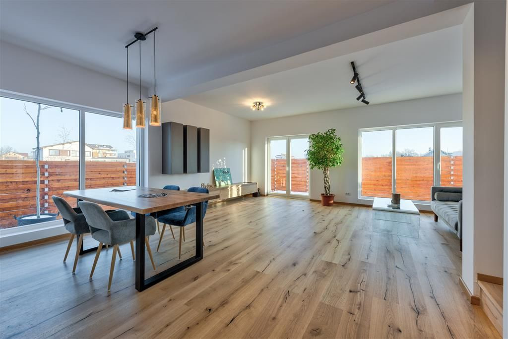 Odata intrati in casa suntem intampinati de un hol cu un mic dressing, util hainelor de iarna, tot din hol avand acces catre baia de la parter, dotata cu dus. Odata patrunsi in livingul spatios observam excelenta amplasare a bucatariei si multiplele variante in care aceasta se poate configura, spre marea bucurie a jumatatii feminine. Inainte sa urci la etaj vei observa in dressing spatios si o alta zona de depozitare, acolo unde nu te-ai fi gandit. Tot acolo se afla distribuitorul sistemului de incalzire in pardoseala, totul marca TECE, iar in peretele din living, la fel ca in orice camera, vei vedea regulatorul de temperatura din acea zona. Da, este posibil sa comanzi separat nivelul temperaturii, in fiecare camera, astfel incat cel mic poate avea 23 grade Celsius, iar in living 20 grade, de exemplu.