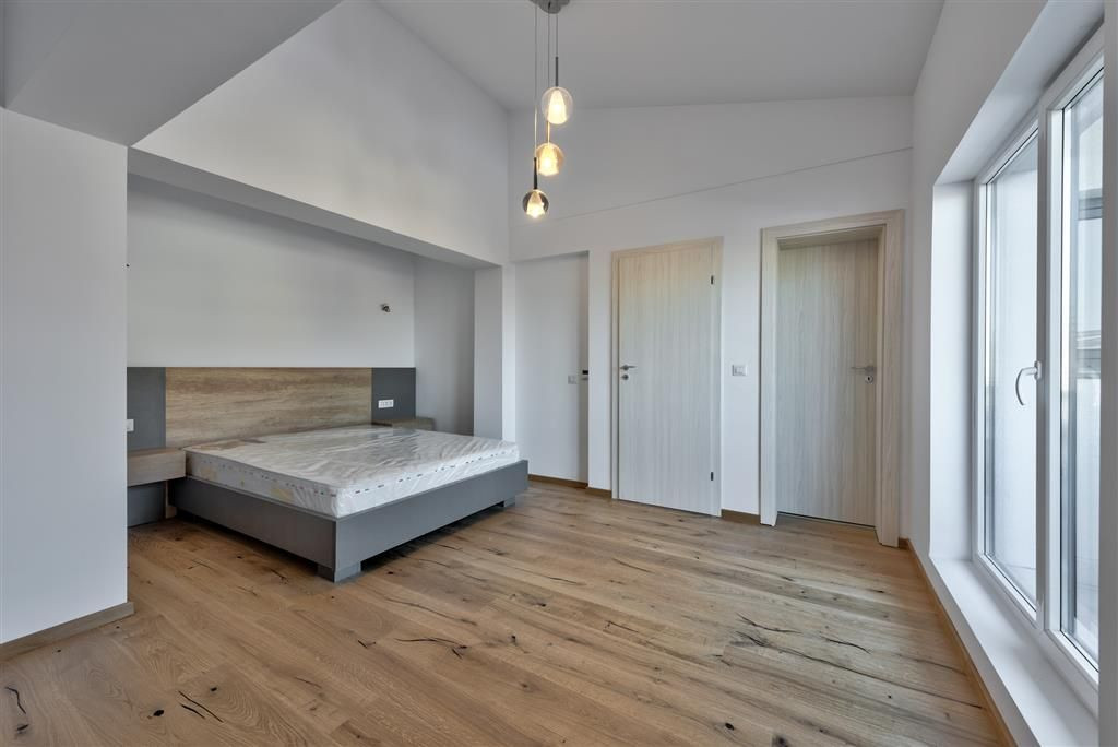 Cand urci catre etaj, pe scara din stejar natur, pe hol privirea iti fuge catre un fain dressing, destinat celor doua dormitoare, ce beneficiaza de o baie, cu acces din acelasi hol. Aceleasi dormitoare au acces catre un balcon comun, ca sa nu fie suparare. Cine se gandeste insa la dormitorul matrimonial are o placuta surpriza, deoarece acesta este extrem de spatios, beneficiaza de un spatiu imens unde iti poti croi un dressing generos. Nu ne oprim aici, pentru intimitatea dorita ai acces la baia proprie a dormitorului. Nu uitam nici de balcon, desigur. Inainte de a cobori la parter ochiul aluneca alene sus catre zona de pod, acolo unde poti sa urci utilizand scara pliabila de acces la pod, raiul spatiilor de depozitare.