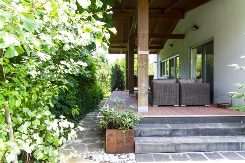 Lemnul exterior al terasei acoperite si cel utilizat in interior (grinzi aparente) si in constructia acoperisului (grinzi, stalpi, capriori, sageac etc.) este lamelar, Glulam.
